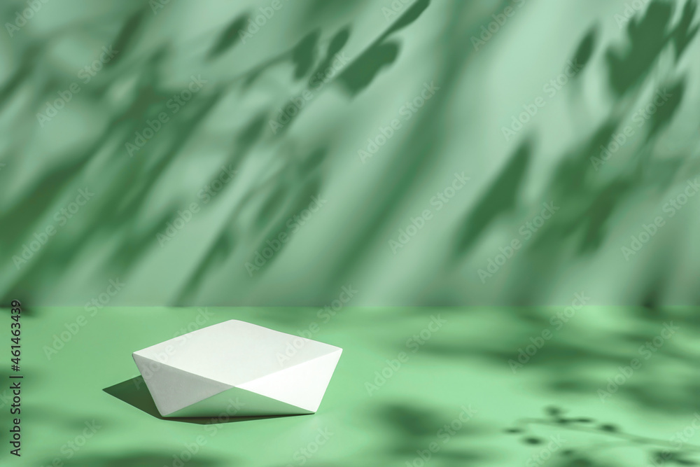 Abstract minimal nature scene - empty stage and polygonal podium on pastel mint green background and soft tree leaves shadows. Pedestal for cosmetic product and packaging mockups display presentation