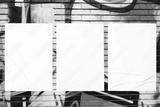 Closeup of colorful messy painted urban wall texture with three wrinkled glued poster templates. Modern mockup for design presentation. Creative urban city background.
