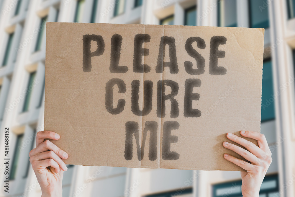 The phrase " Please cure me " on a banner in men's hand with blurred background. Healthcare. Equality. Social issue. Problem. Dangerous. Curable. Illness. Poor. Poorness. Government. Unavailability