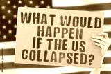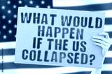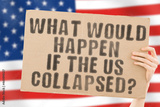 The question " What would happen if the US collapsed? " on a banner in men's hand with blurred American flag on the background. Economy. Financial collapse. Problem. Bankrupt. Dangerous. Crisis