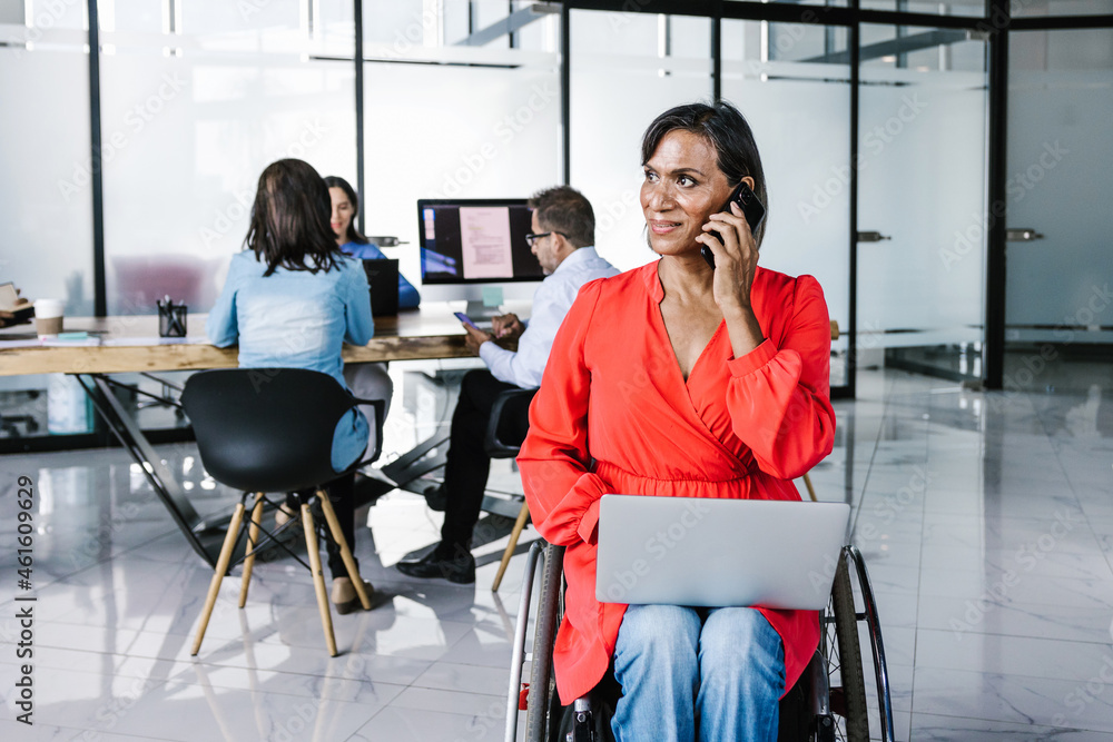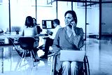 Hispanic transgender businesswoman in wheelchair busy calling on cell phone with laptop on her legs at work in Mexico City