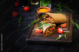 Burritos wraps with beef and vegetables on dark wooden background. Beef burrito, mexican food.