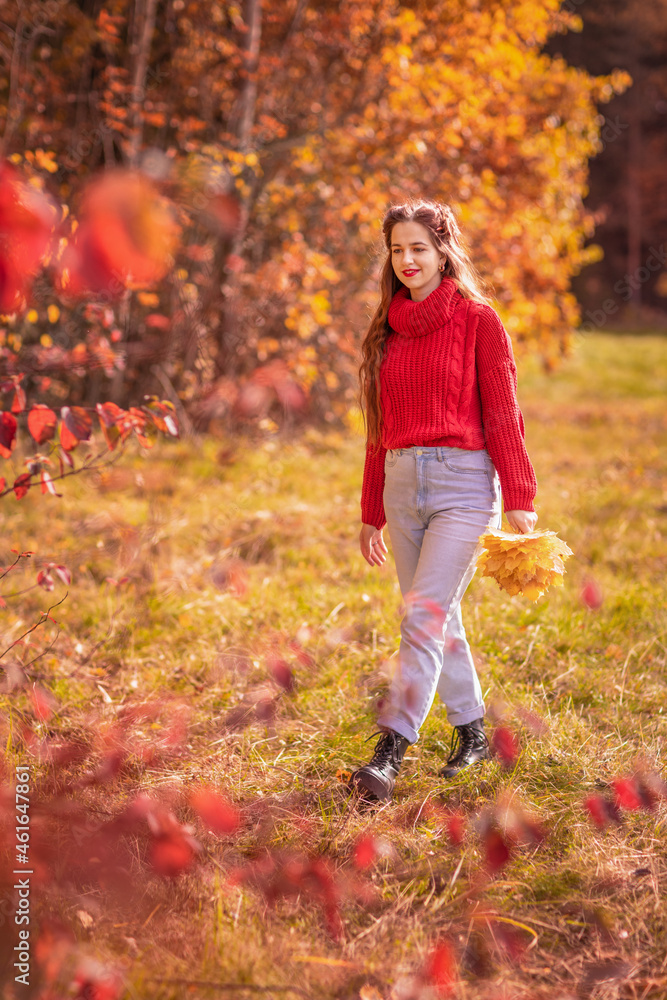 young woman in a red knitted sweater walks in the autumn forest, autumn mood, collect herbarium in the park during the leaf fall season