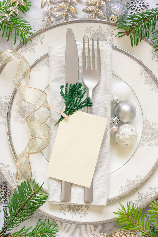Festive table setting of with fir tree branches and Christmas decorations. Card mockup