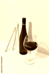 Bottle, glass of wine and grissini on red background with deep shadows. Mock up drink with place for you lable and text