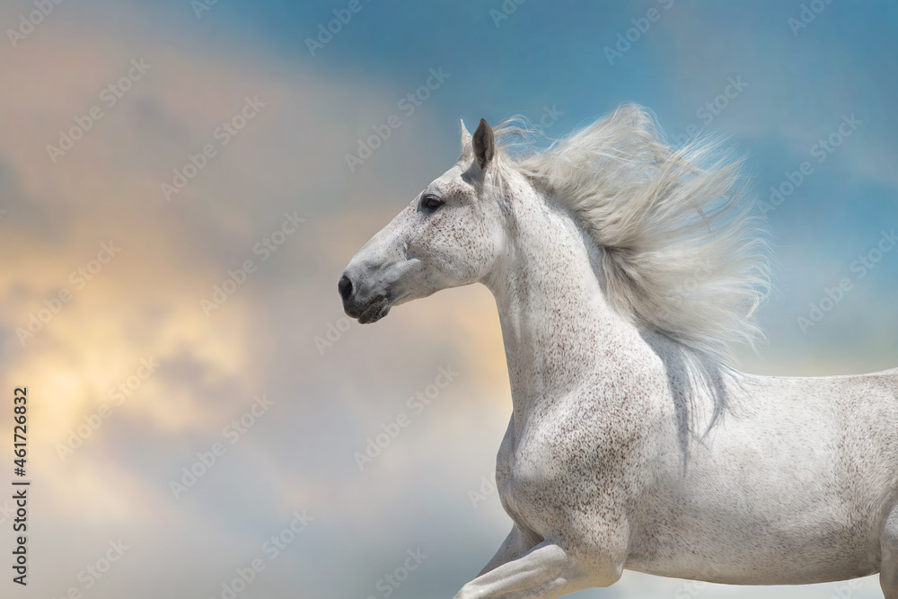 White horse with long mane run free against sunset sky