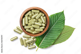 Flat lay of Kratom (Mitragyna speciosa) capsules with fresh leaves isolated on white background.