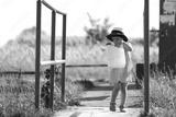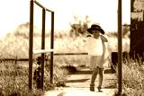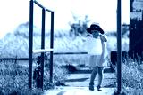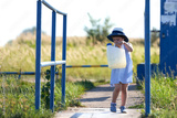 A baby with a heavy can of water at the well. Selective focus. Copy space.