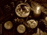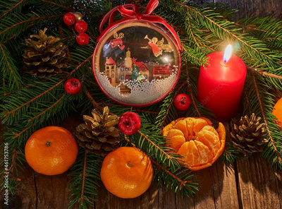 Christmas New Year composition with tangerines. red burning pine cone candle on a dark wooden background.