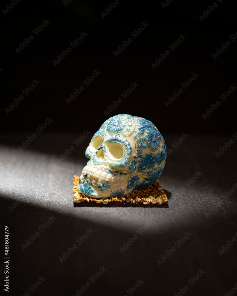 ornamented mexican skull made of white chocolate, traditional gift for "dia de muertos" day of the death in Mexico culture named "calaverita de azucar" or "calaverita de chocolate"