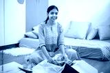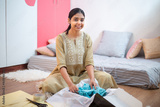 Young small business woman packing clothes or dresses for selling online, startup owner, preparing packaging products for dispatch from home.