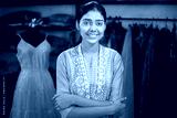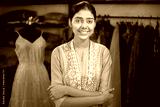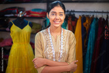 Portrait of Young happy indian woman,tailor or seamstress,smiling fashion designer standing with dress showcase on mannequin in background in garment workshop or studio.Closeup shot