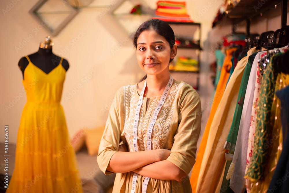 Portrait of Young indian happy woman,tailor,smiling fashion designer,tailoring clothing on mannequin,standing with crossed arms,measurement tape in garment workshop,atelier or studio.Closeup shot