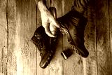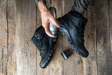 Boots care, shoes care. Man applying a special waterproof spray to trekking shoes. Top view.