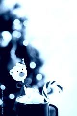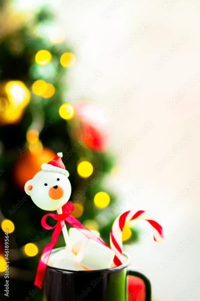 Christmas lollipops in a cup with Christmas decorations on a table on a light background. Gingerbread in the form of a minishka in a New Year's hat. Postcard.Homemade Chocolate