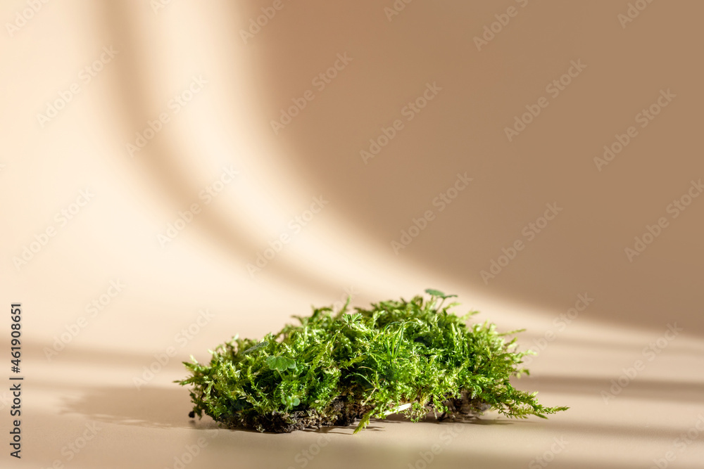 Natural podium for organic cosmetic product. Green moss isolated on pastel background with shadow. Stand for display product. Minimal concept. Presentation and exhibitions. Mock up