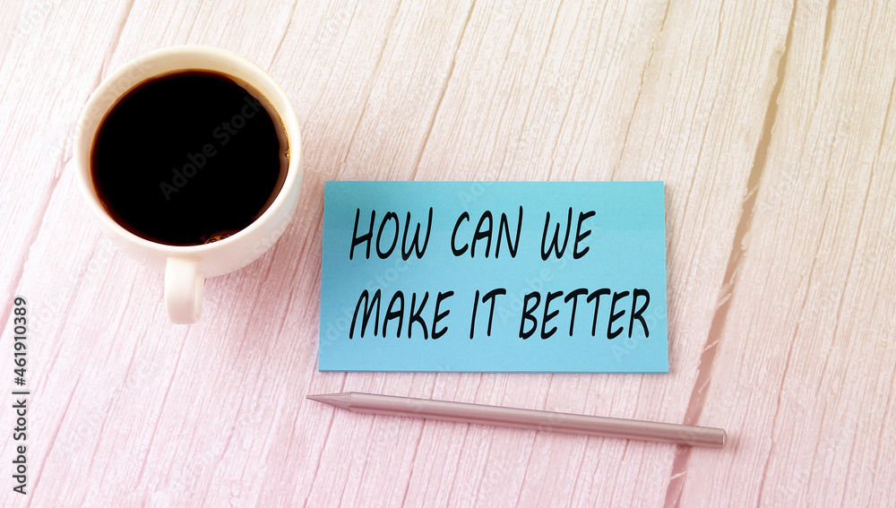 How Can We Make It Better text on the blue sticker with cofee and pen