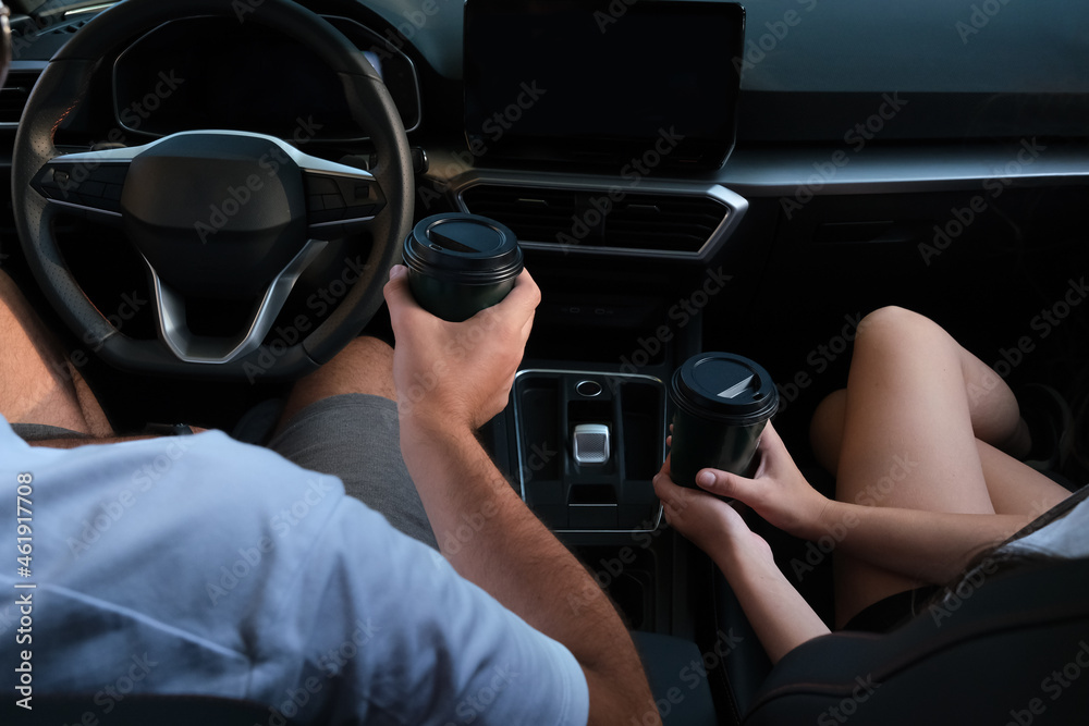couple drinking coffee in the car