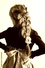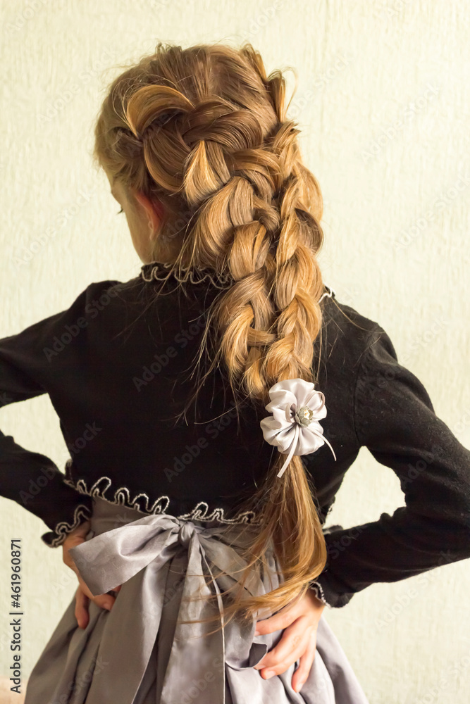 On the head of a little girl, in festive clothes, beautifully woven braids.