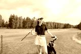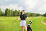 Woman in stylish summer golf outfit walking with bag of drivers on beautiful green course for golf game.