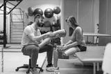 Physiotherapist helping young woman with prosthetic legs
