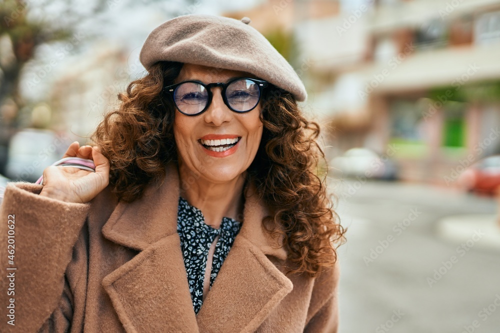Middle age hispanic woman smiling happy shopping at the city.