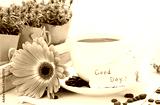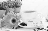 cup of coffee and gerbera beans, cinnamon sticks on wooden