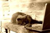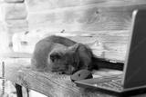 gray cat resting on a bench near the house, next to the blurred silhouettes of a laptop and a mouse. break from remote work