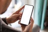 Man using smartphone blank screen frameless modern design while sitting on the chair in home interior