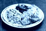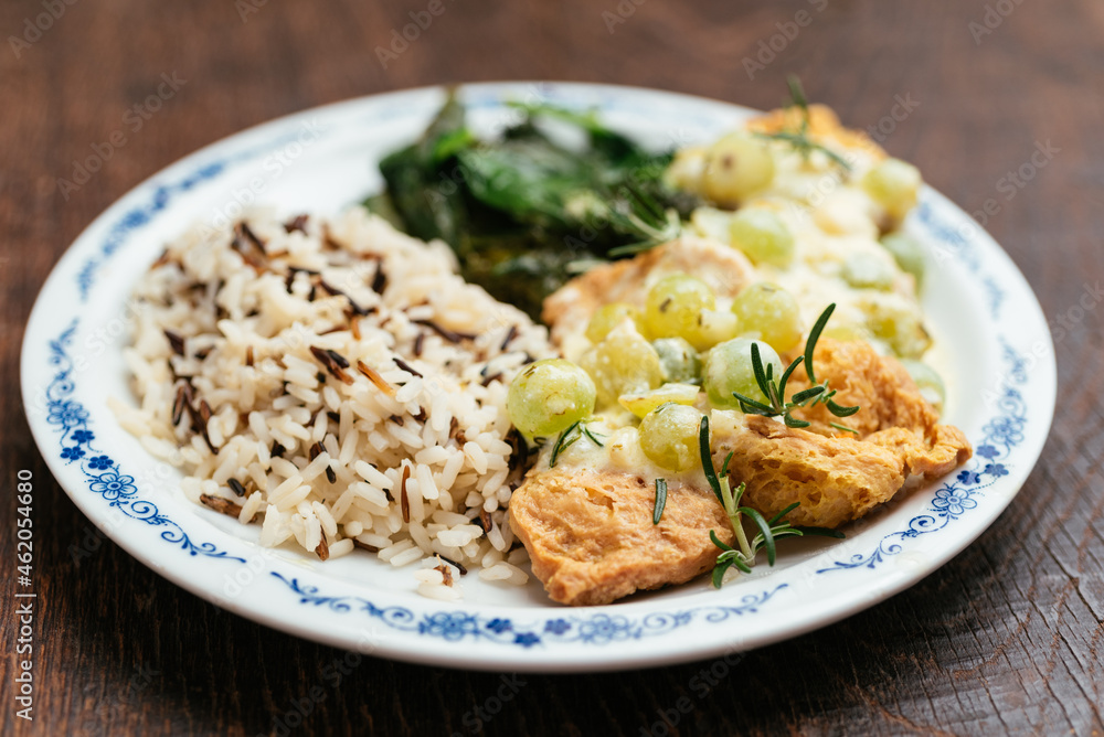 Plate with rice and soy medallions with a creamy grape sauce.