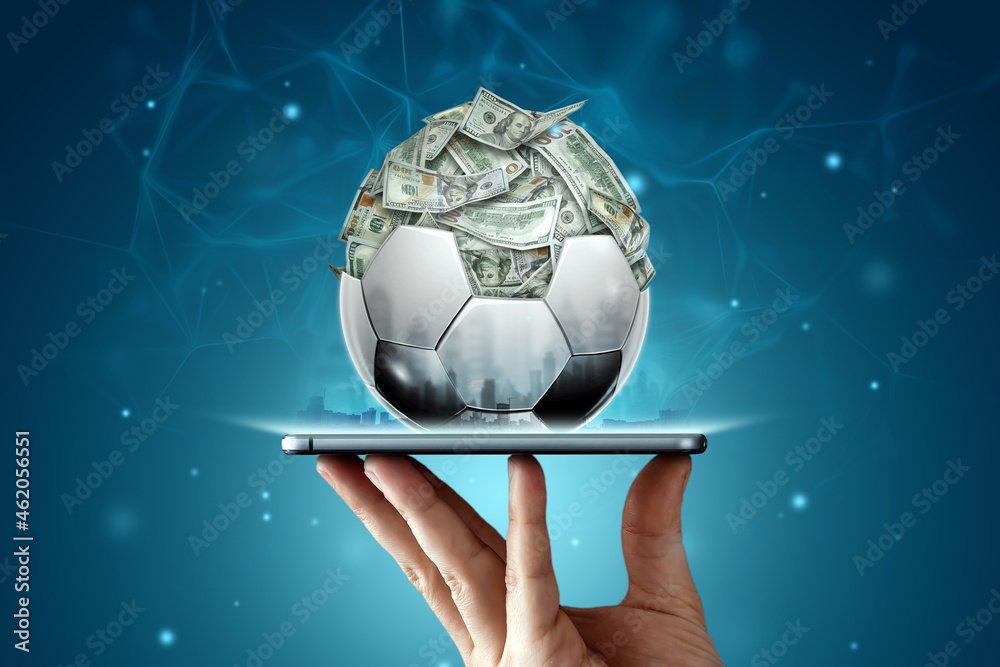 Dollars are inside the soccer ball, the ball is filled with money in a smartphone. Sports betting, soccer betting, gambling, bookmaker, big win.