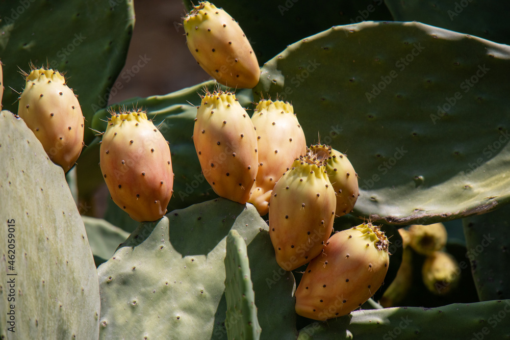 Orange prickly pear with thorns on green spiny cactus leaves.