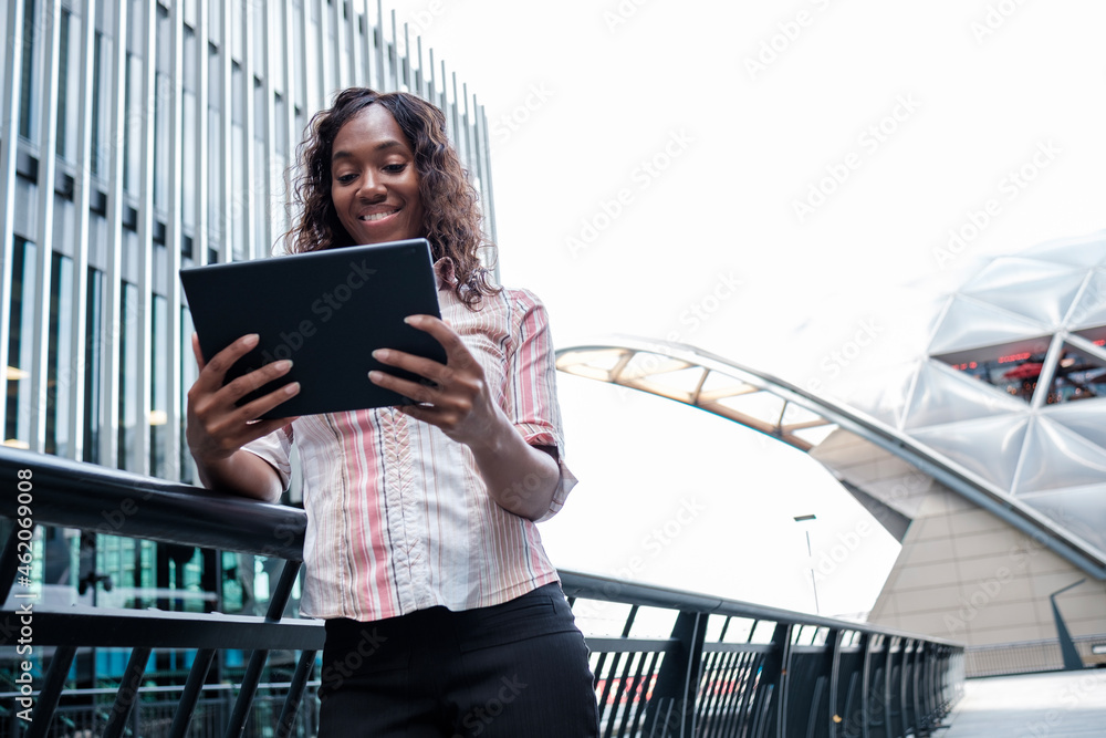 Smiling business woman looking to a tablet.