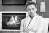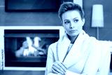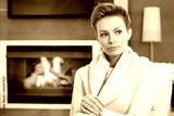 Beautiful woman thinking by fireplace