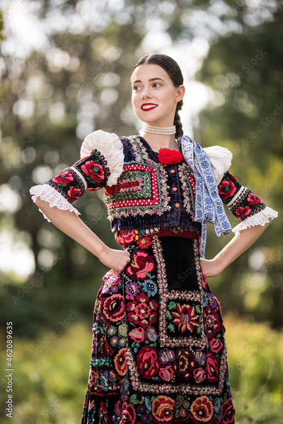 Young beautiful slovak woman in traditional dress. Slovak folklore
