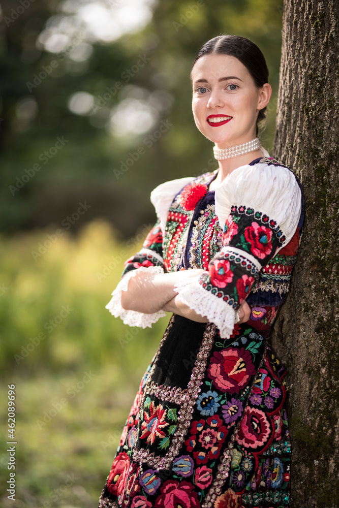Young beautiful slovak woman in traditional dress. Slovak folklore