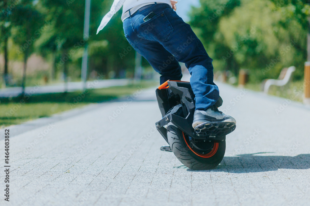 Landscape with green grass, leafless trees and stream under blue sky on sunny day, forest or park.