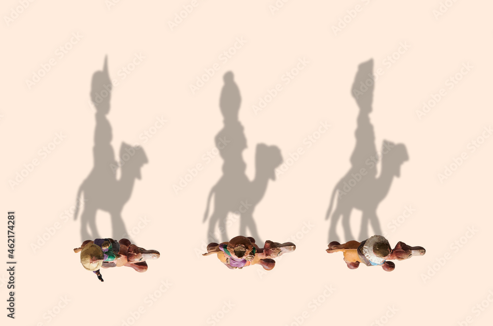 Wise men on camel high view, shadows drawing the wise men with copy space