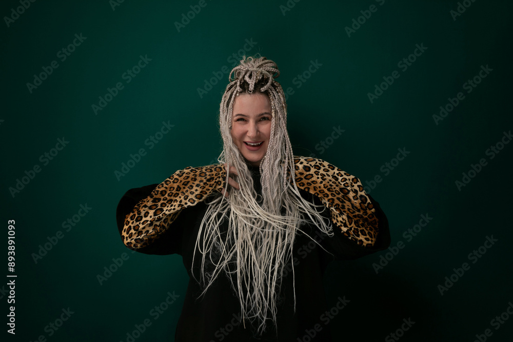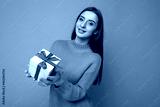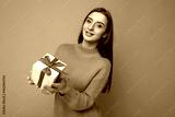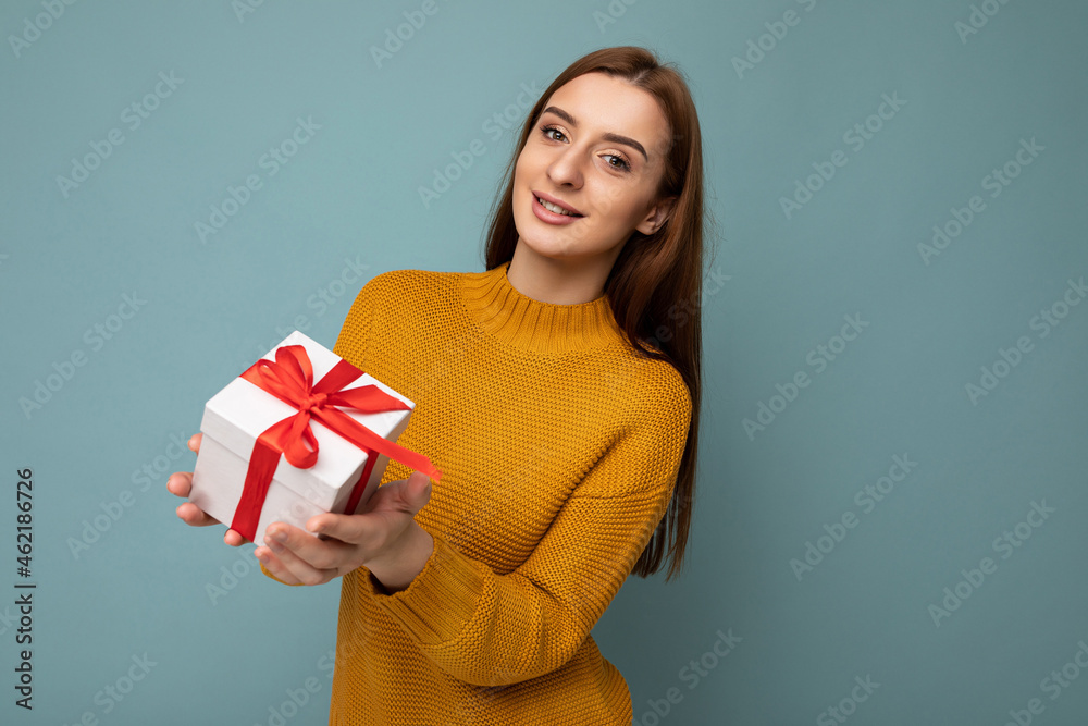 Beautiful happy young brunette woman isolated over colourful background wall wearing stylish casual clothes holding gift box and looking at camera