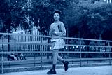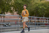 Carefree Afro American woman strolls outside in urban setting dressed in fashionable outfit carries notepad returns happy after studying glad to notice friend at street. Student walks with organizer