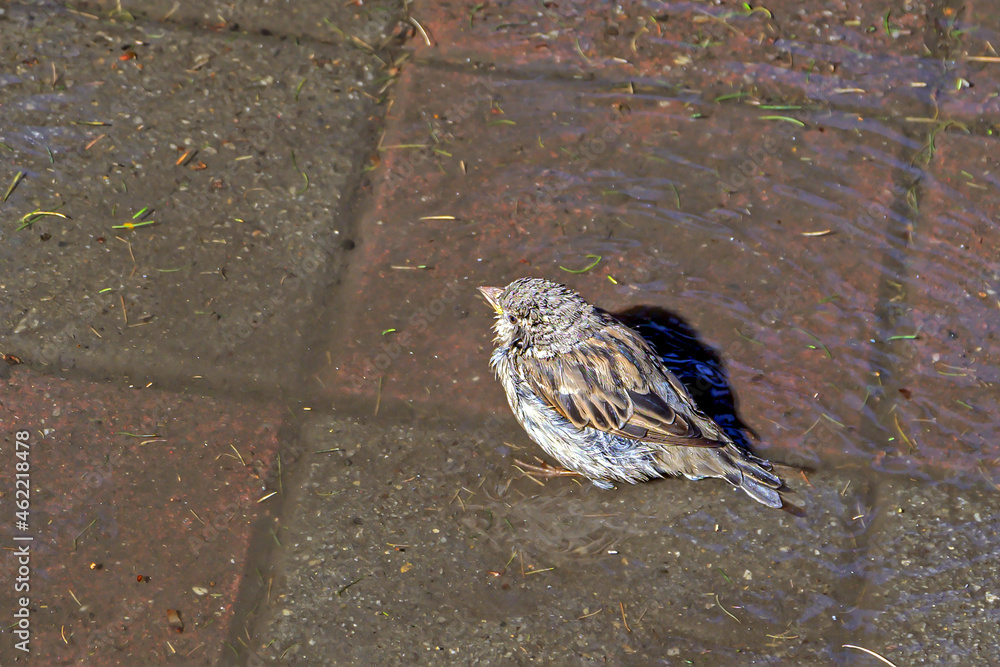 A sparrow bathes in a puddle on the city pavement on a summer day