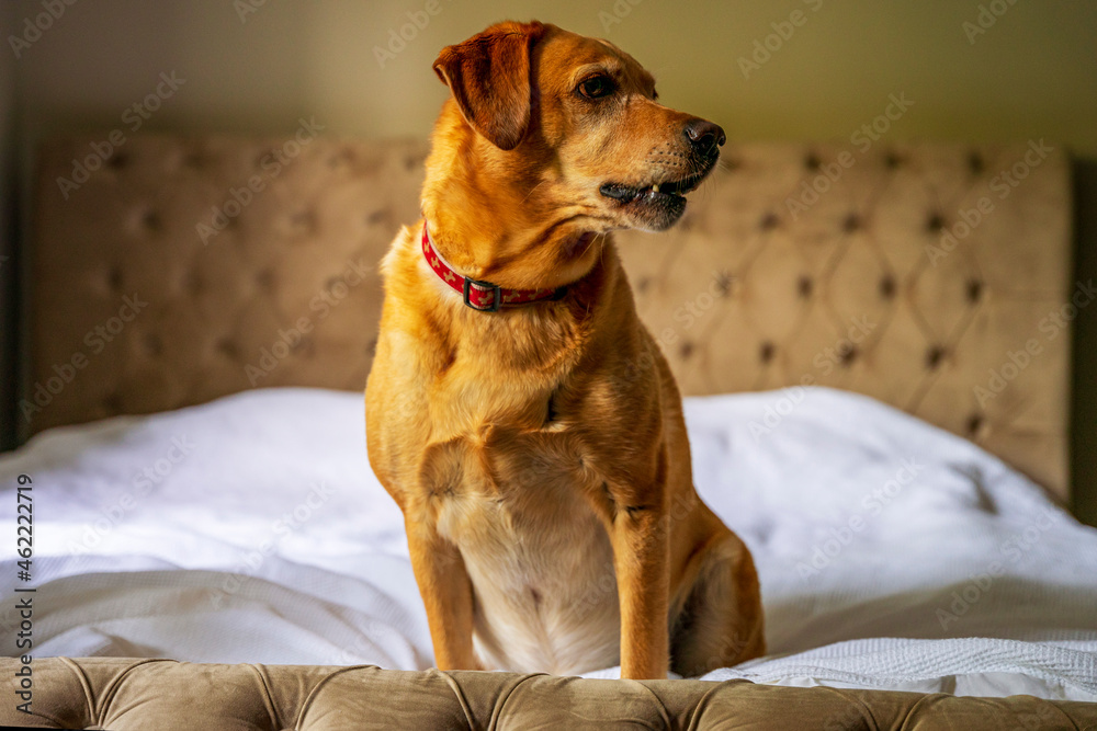 Labrador siedzi na kanapie, patrzy w bok od kamery, szczeka.
