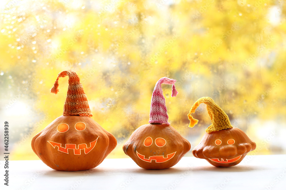 three smiling pumpkins in knitted caps against the background of an autumn window. mood for the holiday halloween