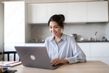 Smiling young female working on laptop, data analysis in modern kitchen, checking email, typing message in social networks. Happy girl successful freelancer work online on computer at home office.