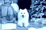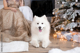 cute white fluffy samoyed dog sits at home near a decorated christmas tree