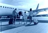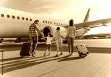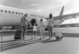 Smiling parents and kids walking with travel bags with a big plane in the background. Trip concept