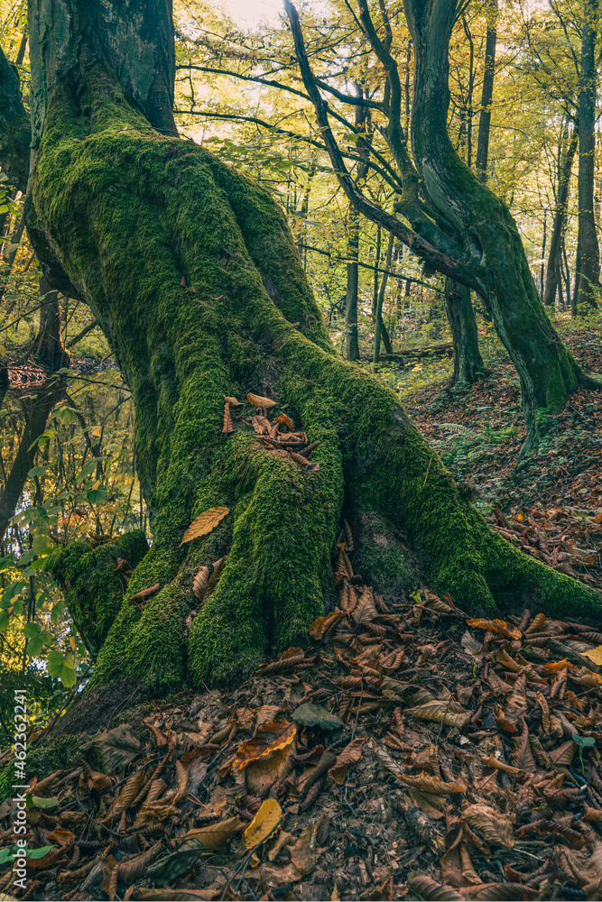 Stary las grądowy. Rezerwat Grądy nad Moszczenicą, drzewo porośnięte mchem
