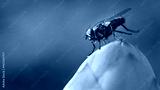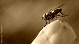 Close up or Macro flies are climbing on a part of the flower bud. The red-eyed fly has full body hair.