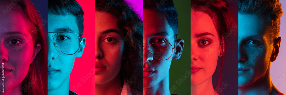 Cropped portraits of group of multiethnic people on multicolored background in neon light. Collage made of 6 models