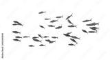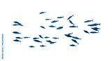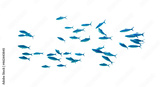 Shool of blue tropical striped fish in the ocean isolated on white background. Caesio Striata (Striated Fusilier) swimming deep underwater in Red Sea. Flock of tropical blue fish, cut out.